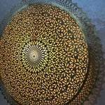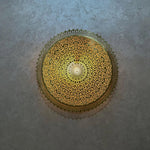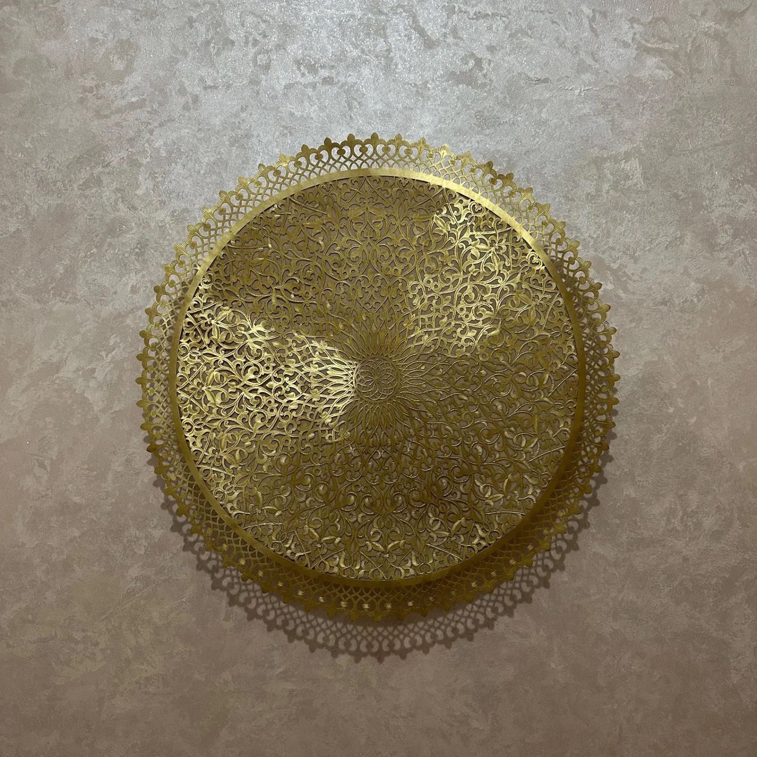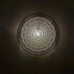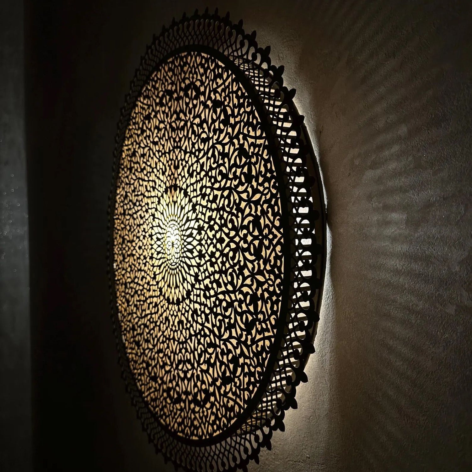This handcrafted round brass wall light features traditional Moroccan-inspired engraving and precise perforated cutwork. Each piece is shaped and detailed by skilled artisans, creating a refined balance between craftsmanship and illumination.