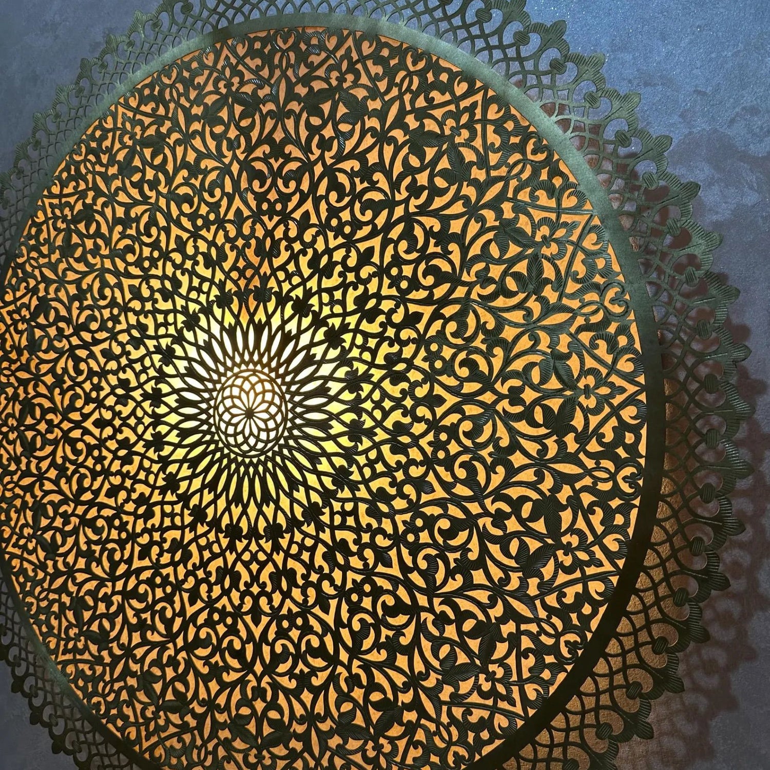 When lit, the intricate pattern diffuses light softly and projects decorative shadow textures across surrounding surfaces. The result is a warm ambient glow that functions as both lighting and a visual focal point.
