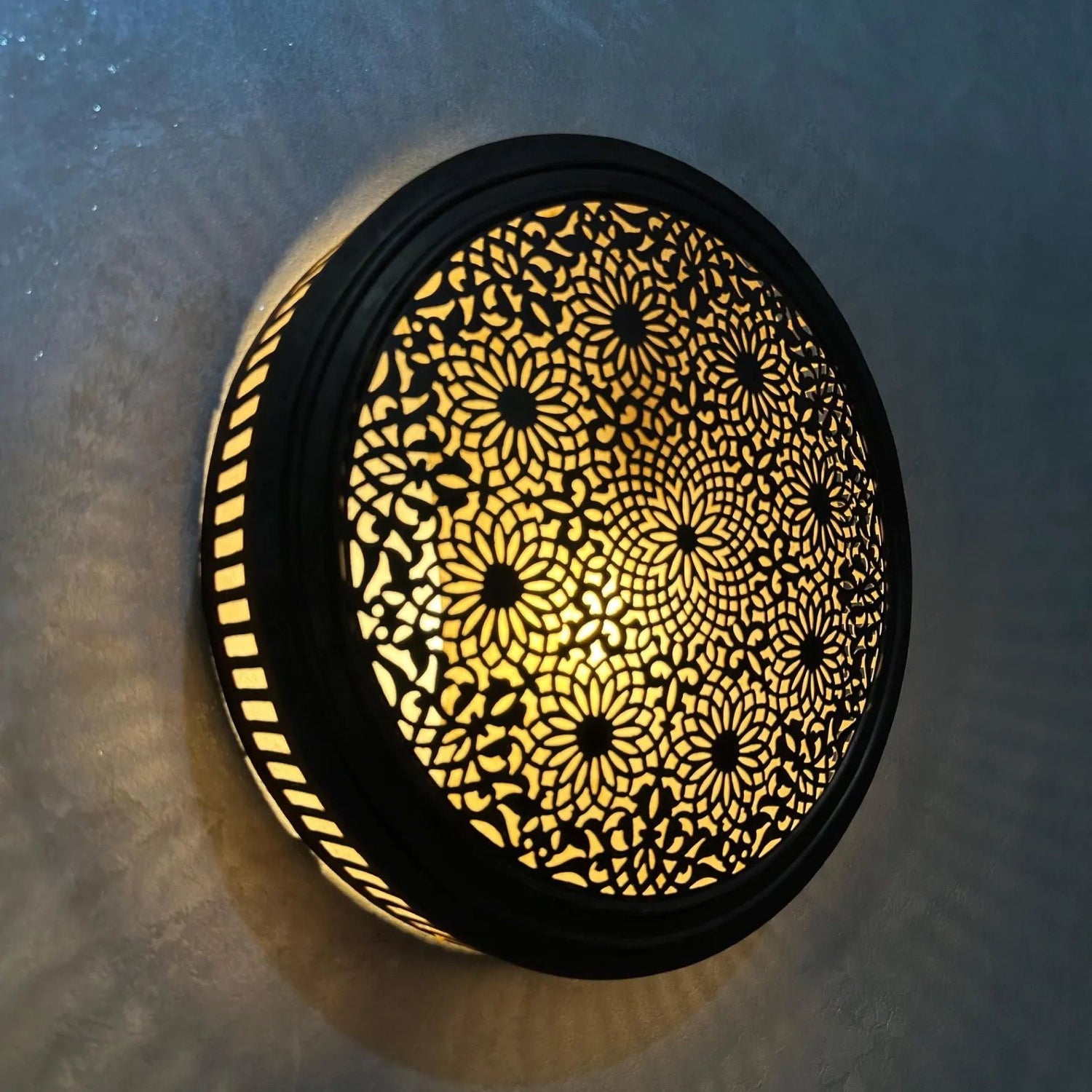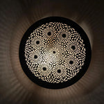 The intricate cutwork allows light to diffuse softly, projecting decorative shadow patterns that enhance surrounding walls. When illuminated, the fixture becomes both a functional light source and an architectural focal point.