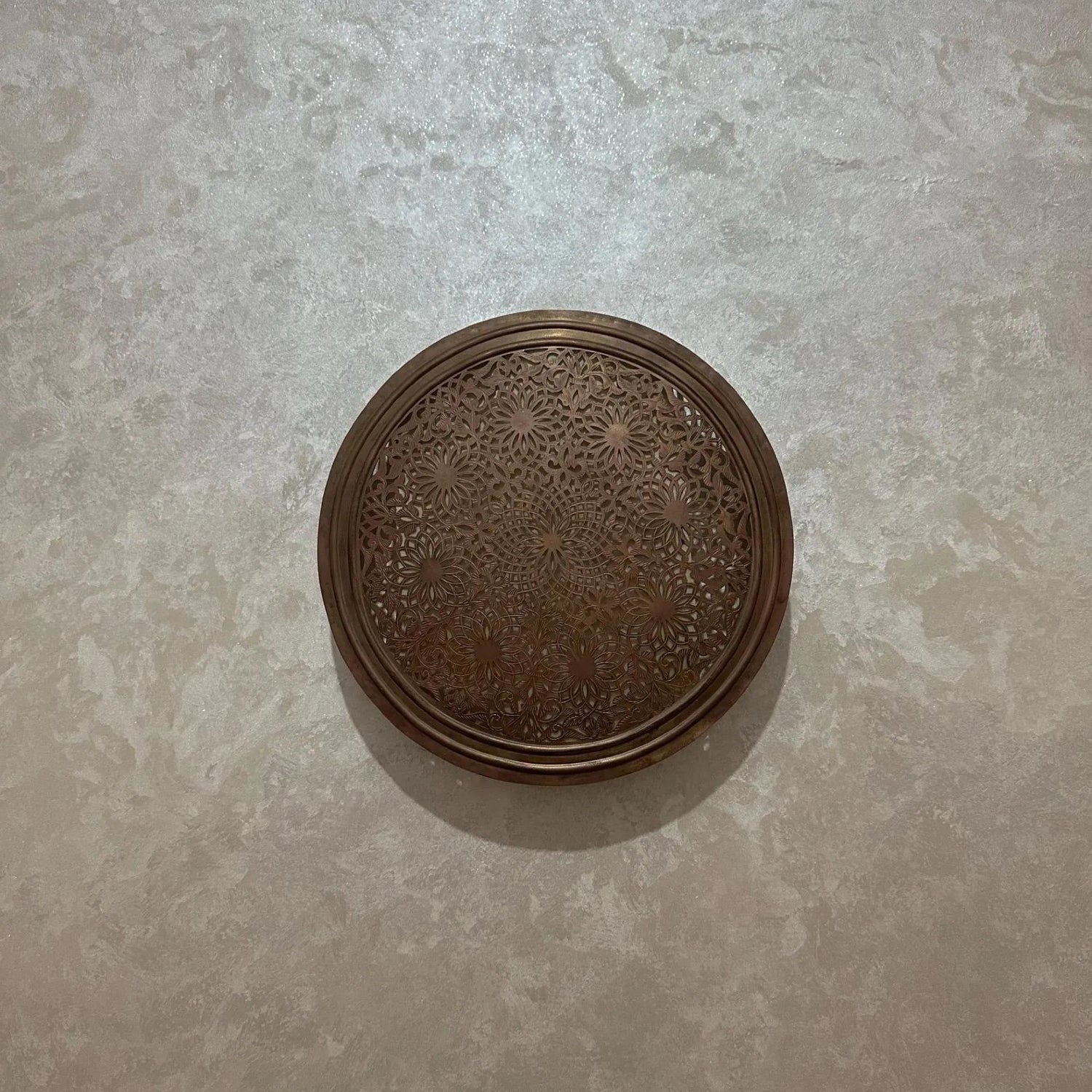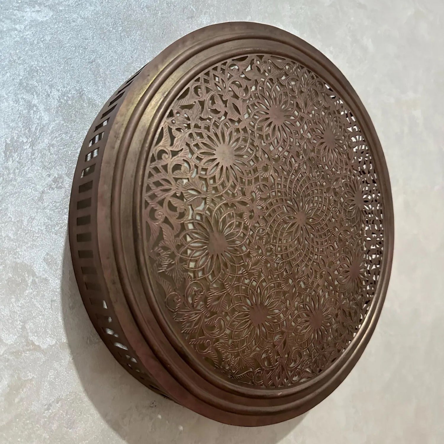 This handcrafted round brass wall sconce reflects traditional Moroccan metalworking techniques and detailed geometric engraving. Each piece is shaped, perforated, and finished by skilled artisans, creating a balanced combination of craftsmanship and illumination.